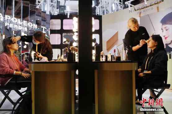 Visitors try out cosmetic products at the consumer goods exhibition area during the China International Import Expo (CIIE). (China News Service/Yin Liqin)