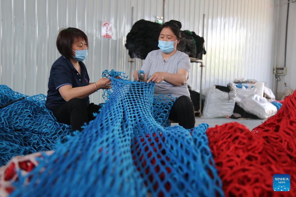 Workers check nets at a workshop of an enterprise in Lizhuang Township of Huimin County, east China's Shandong Province, May 21, 2022.