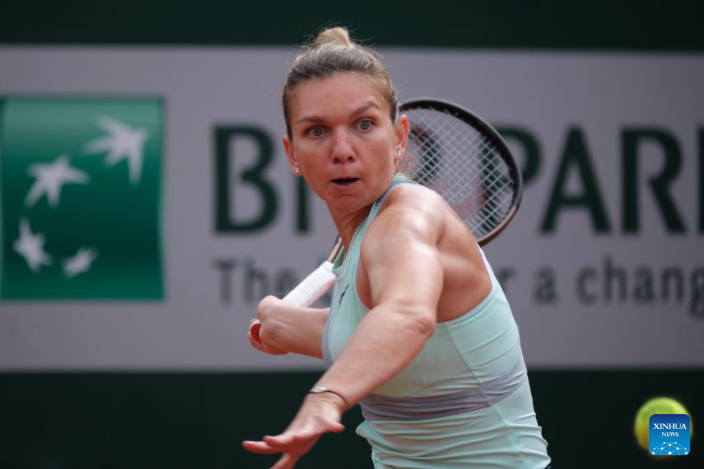 Simona Halep returns a shot during the women's singles second round match between Zheng Qinwen of China and Simona Halep of Romania at the French Open tennis tournament at Roland Garros in Paris, France, on May 26, 2022. (Xinhua/Meng Dingbo)