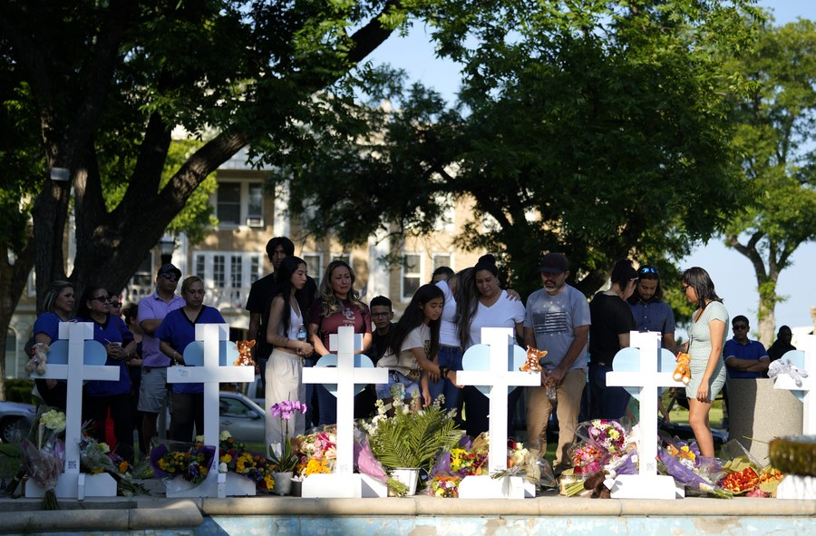 People mourn for victims of a school mass shooting in Uvalde, Texas, the United States, May 26, 2022. (Xinhua/Wu Xiaoling)