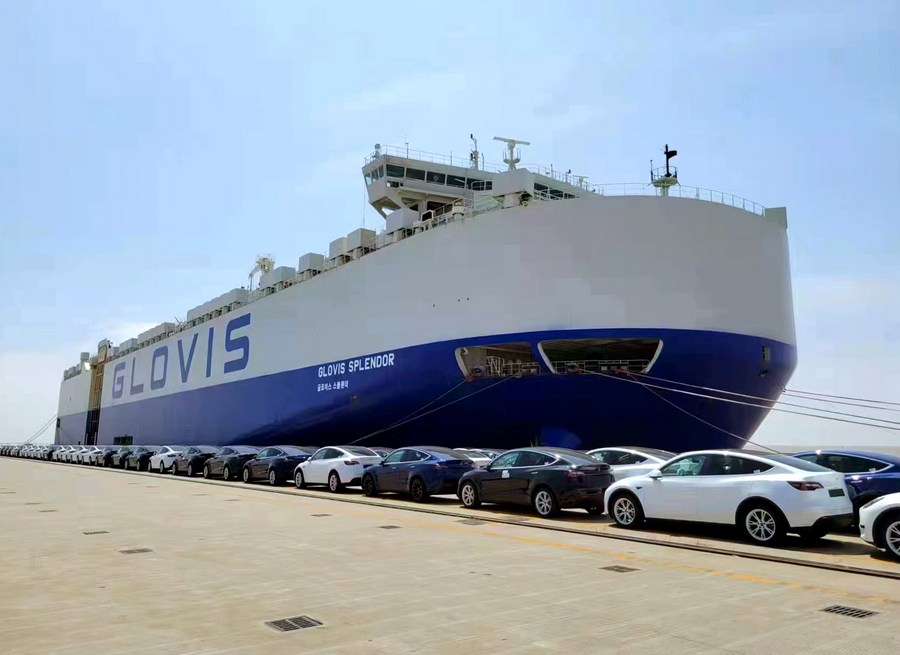 A ship is loaded with electric cars produced by U.S. automaker Tesla's Shanghai Gigafactory at a port in east China's Shanghai, May 11, 2022. (Xinhua)