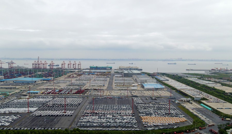 Aerial photo shows a view of Shanghai Haitong International Automotive Terminal at Waigaoqiao in Shanghai, east China, May 25, 2022. (Xinhua/Fang Zhe)