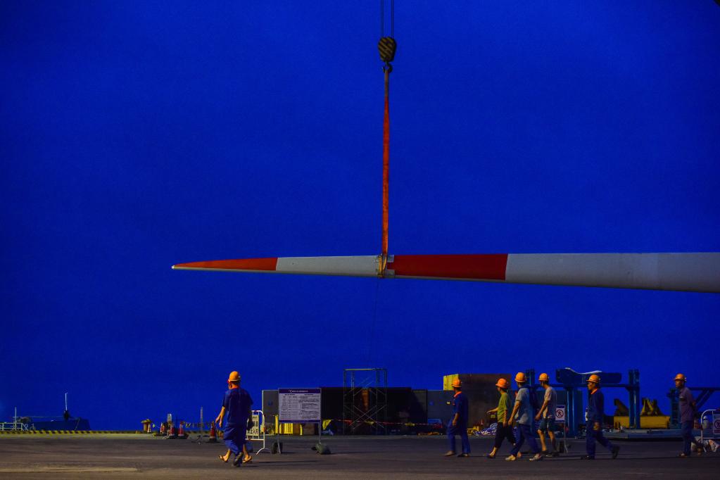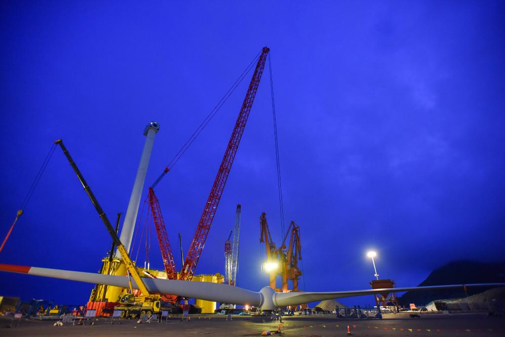 Photo taken on May 26, 2022 shows the blades of a deep-sea floating wind power equipment "Fuyao" being assembled in Maoming, south China's Guangdong Province. China's first deep-sea floating wind power equipment "Fuyao" was towed in Maoming, south China's Guangdong Province on Sunday. It will be tested in Luodousha sea area where the average water depth is 65 meters. "Fuyao" wind turbine is equipped with 6.2 megawatt typhoon-resistant wind power generating units. (Xinhua/Liu Dawei)