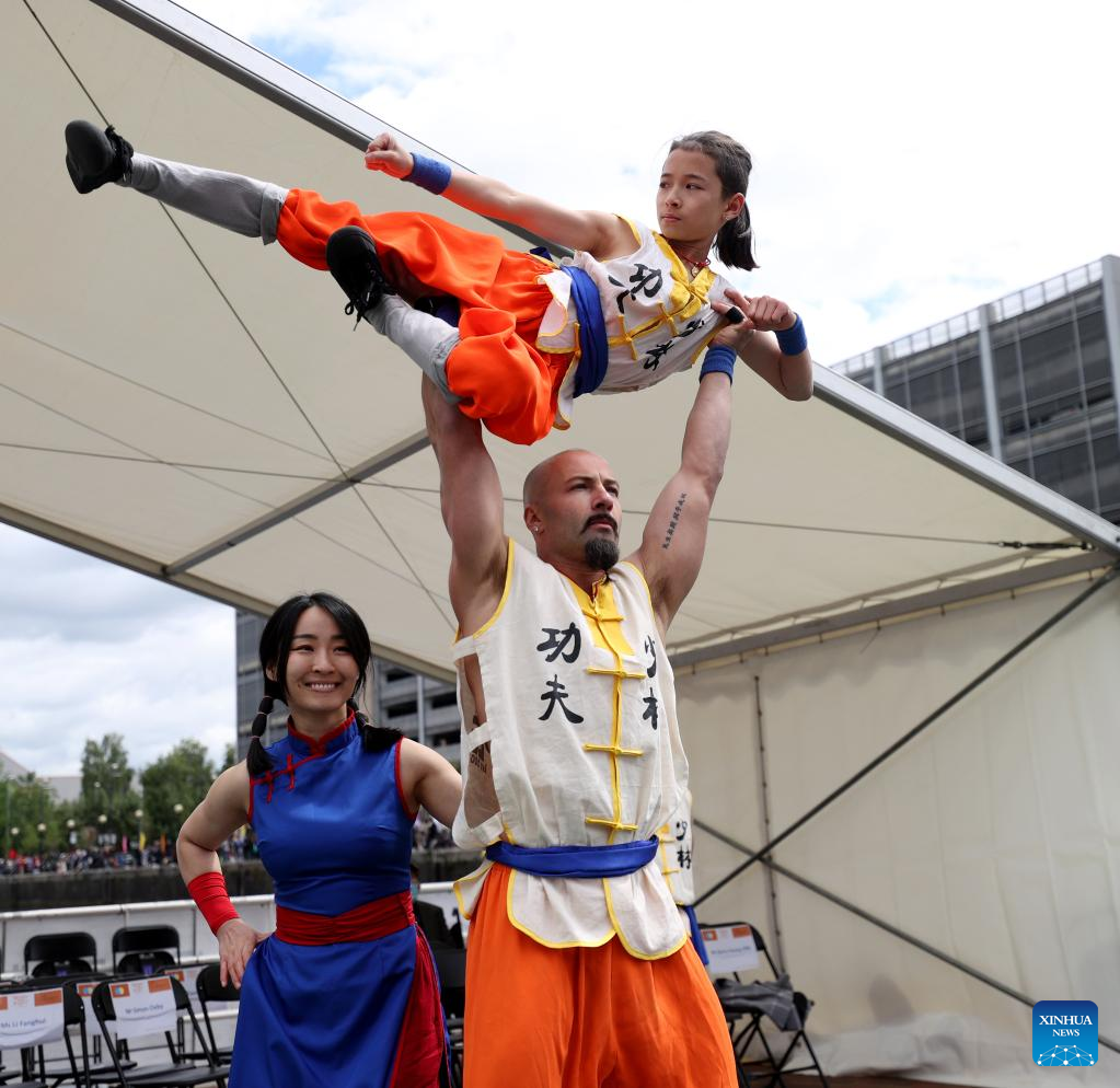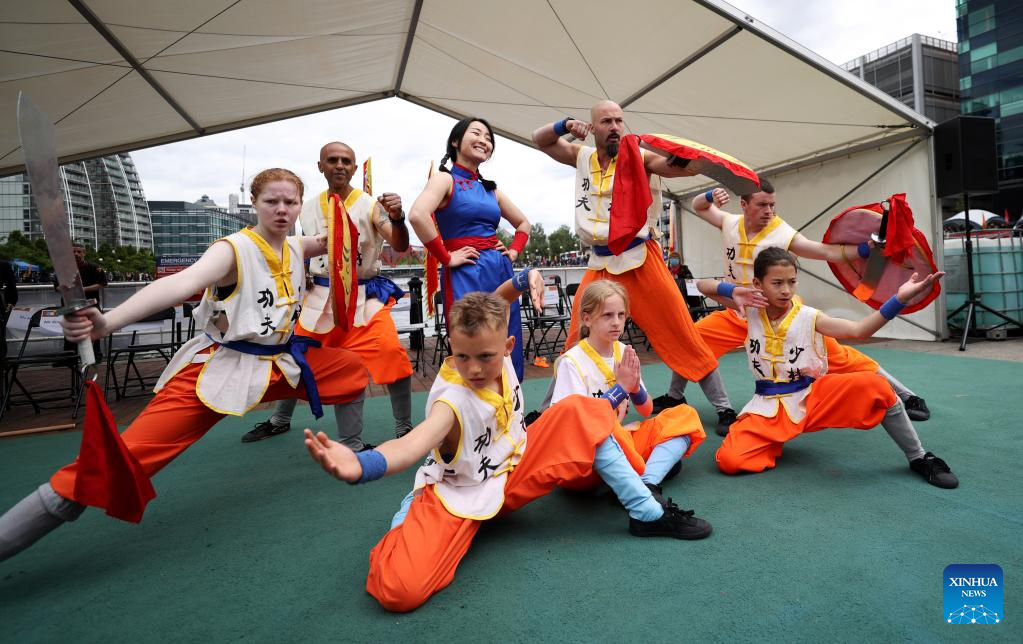 People perform Chinese martial art during the 2022 UK Chinese Dragon Boat Festival in Salford, Britain, May 29, 2022. A total of 36 teams took part in the dragon boat race. The festival also featured performances including Chinese lion dance, martial arts and calligraphy. (Xinhua/Li Ying)
