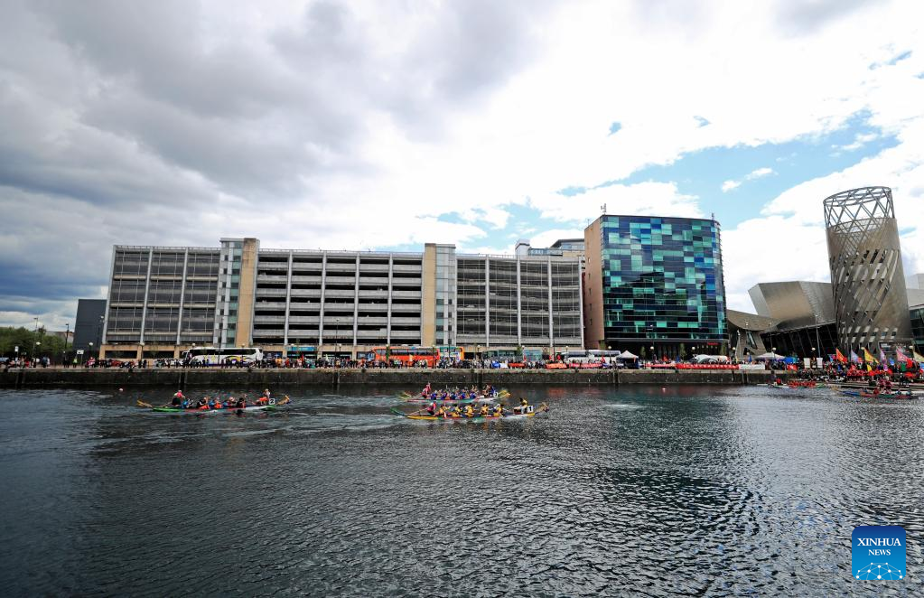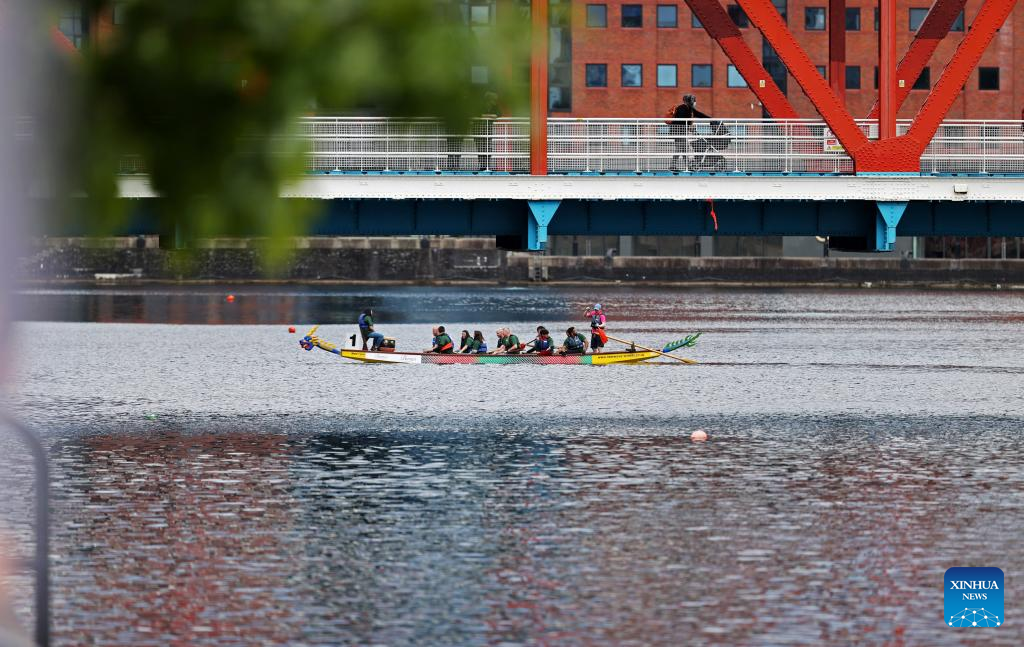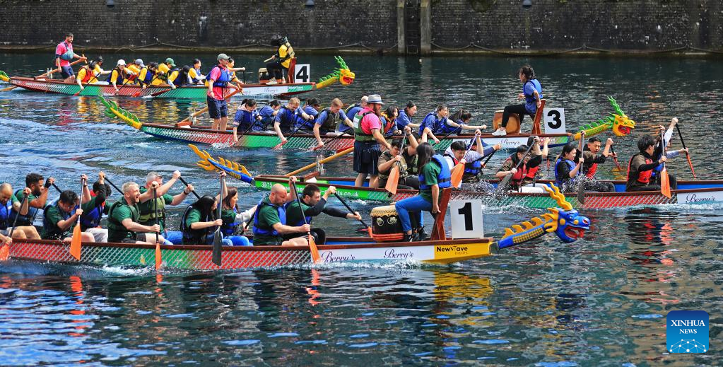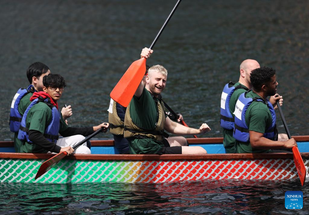 Contestants compete during the 2022 UK Chinese Dragon Boat Festival in Salford, Britain, May 29, 2022. A total of 36 teams took part in the dragon boat race. The festival also featured performances including Chinese lion dance, martial arts and calligraphy. (Xinhua/Li Ying)