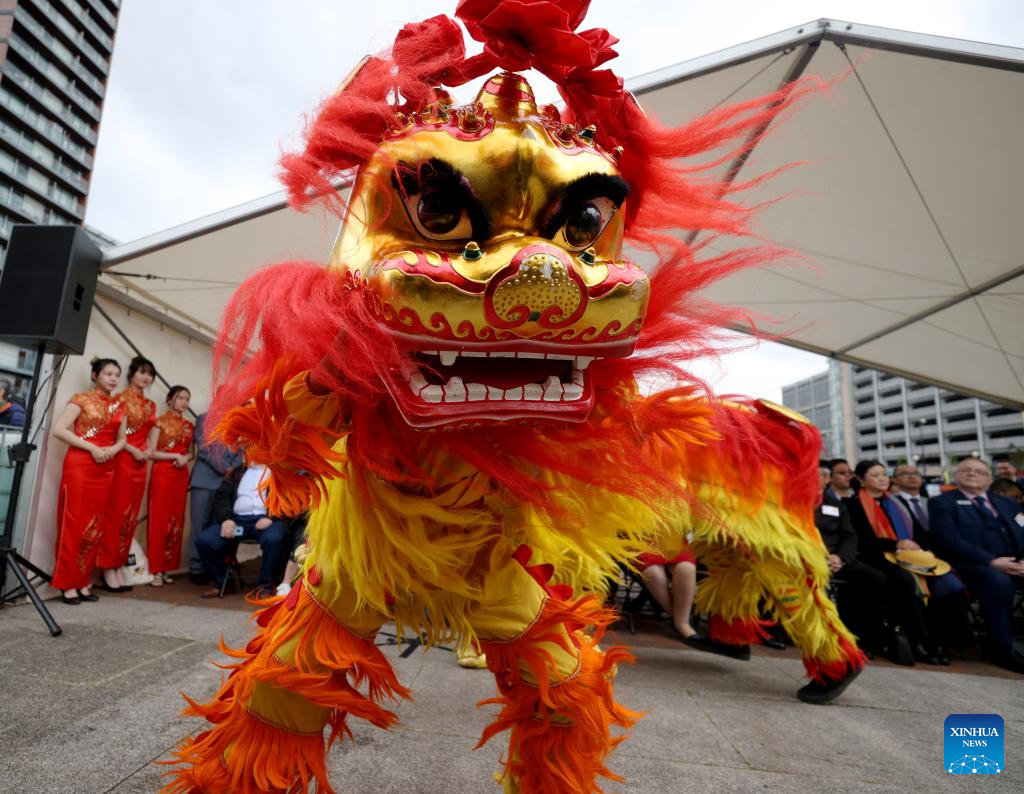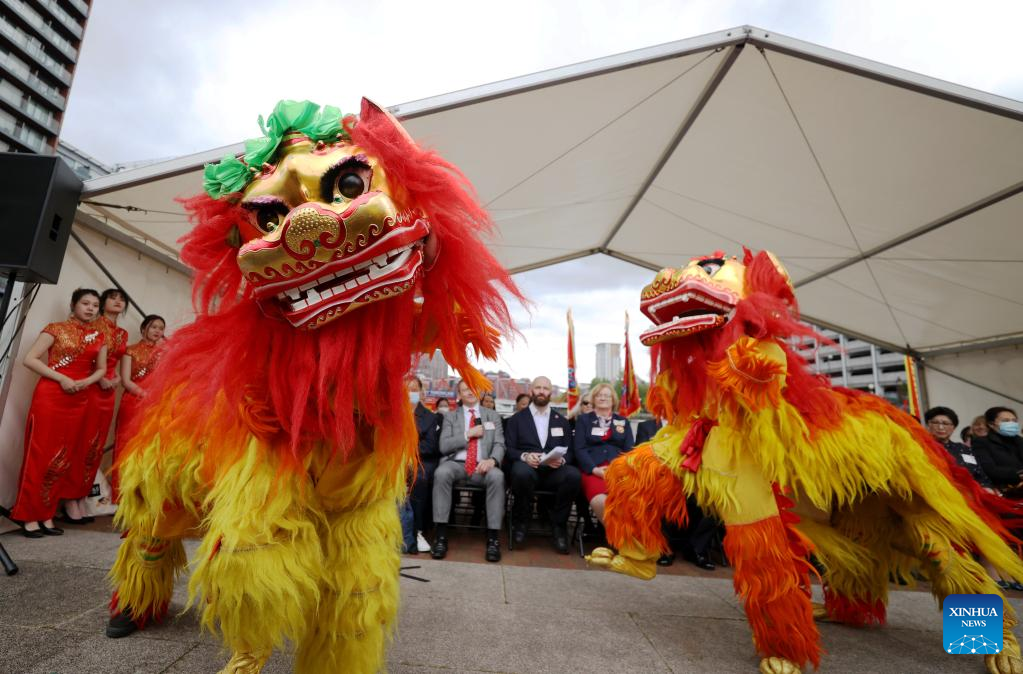 People perform Chinese lion dance during the 2022 UK Chinese Dragon Boat Festival in Salford, Britain, May 29, 2022. A total of 36 teams took part in the dragon boat race. The festival also featured performances including Chinese lion dance, martial arts and calligraphy. (Xinhua/Li Ying)