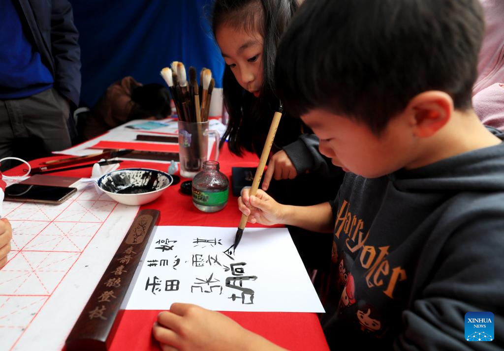 A boy writes with an ink brush during the 2022 UK Chinese Dragon Boat Festival in Salford, Britain, May 29, 2022. A total of 36 teams took part in the dragon boat race. The festival also featured performances including Chinese lion dance, martial arts and calligraphy. (Xinhua/Li Ying)