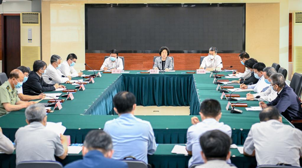 Chinese Vice Premier Sun Chunlan, also a member of the Political Bureau of the Communist Party of China Central Committee, hosts a symposium on preparation work of China's national college entrance exam for 2022 at China's National Education Examinations Authority during an inspection tour in Beijing, capital of China, May 30, 2022. (Xinhua/Zhai Jianlan)