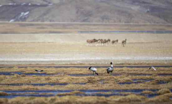 Wild animals including black-necked cranes and kiangs (Equus kiang) live in harmony in Burang county, Ngari prefecture, southwest China’s Tibet autonomous region, April 22, 2022. (People’s Daily Online/Liu Xiaodong)