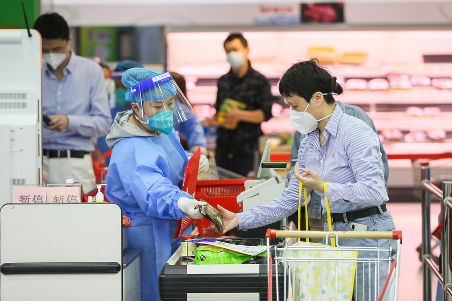 People shop at a supermarket in Xuhui District of east China's Shanghai, May 16, 2022. (Xinhua/Ding Ting)