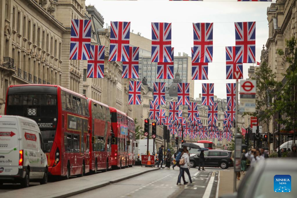 Photo taken on May 30, 2022 shows flags flying over Regent Street in preparation for the Platinum Jubilee celebrations for Britain's Queen Elizabeth II in London, Britain. (Photo by Tim Ireland/Xinhua)