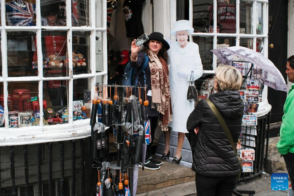A woman takes a selfie at a shop decorated in preparation for the Platinum Jubilee celebrations for Britain's Queen Elizabeth II in London, Britain, May 30, 2022. (Photo by Tim Ireland/Xinhua)