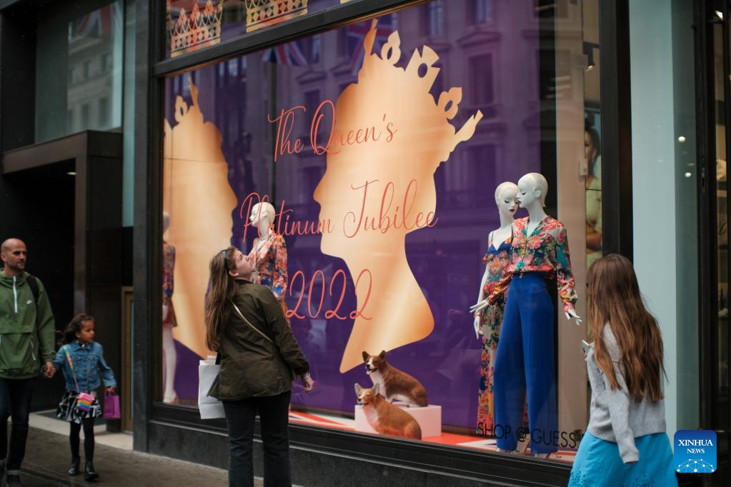 Photo taken on May 30, 2022 shows window display of a store in Regent Street in preparation for the Platinum Jubilee celebrations for Britain's Queen Elizabeth II in London, Britain. (Photo by Tim Ireland/Xinhua)