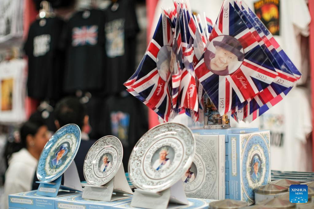 Photo taken on May 30, 2022 shows merchandise on sale near Piccadilly Circus in preparation for the Platinum Jubilee celebrations for Britain's Queen Elizabeth II in London, Britain. (Photo by Tim Ireland/Xinhua)