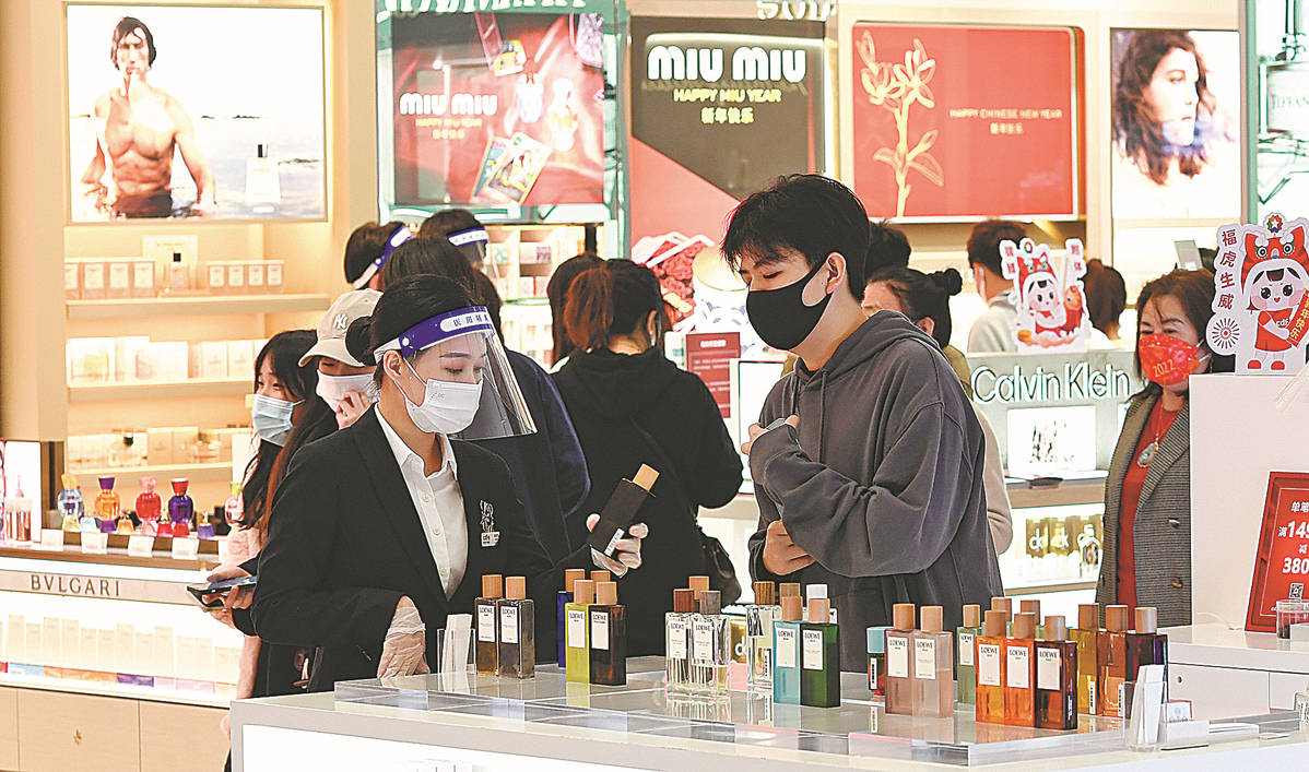 Consumers check out products at a duty-free shop in Haikou in February. [Photo/Xinhua]