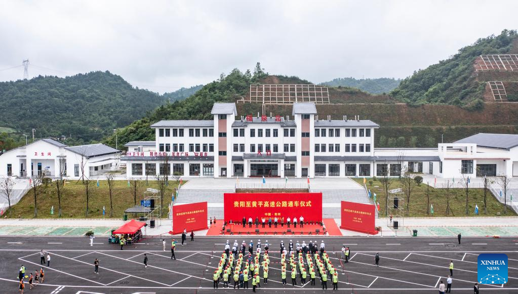 Aerial photo taken on May 31, 2022 shows the opening ceremony of Guiyang-Huangping Highway at Fuquanbei service area in southwest China's Guizhou Province. The Guiyang-Huangping Highway was opened to traffic on Tuesday, shortening the travel time between Guiyang City and Huangping County of Guizhou Province from the current 3.5 hours to just about one hour and 20 minutes. The main line of this highway stretches 120.6 kilometers and connects Guizhou with the Yangtze River Delta region. (Xinhua/Tao Liang)
