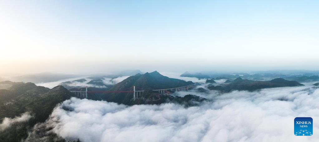Aerial panoramic photo taken on March 28, 2022 shows the Yangbaoshan grand bridge along the Guiyang-Huangping Highway in southwest China's Guizhou Province. The Guiyang-Huangping Highway was opened to traffic on Tuesday, shortening the travel time between Guiyang City and Huangping County of Guizhou Province from the current 3.5 hours to just about one hour and 20 minutes. The main line of this highway stretches 120.6 kilometers and connects Guizhou with the Yangtze River Delta region. (Xinhua/Yang Wenbin)
