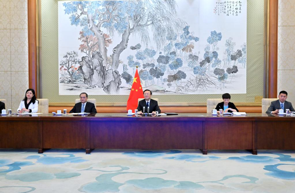 Yang Jiechi, a member of the Political Bureau of the Communist Party of China (CPC) Central Committee and director of the Office of the Foreign Affairs Commission of the CPC Central Committee, holds a video meeting upon invitation with Jens Plotner, foreign and security policy advisor to the German chancellor, in Beijing, capital of China, May 31, 2022. (Xinhua/Yue Yuewei)