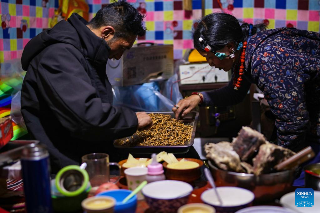 During the caterpillar fungus harvest time, the herdsmen make their home temporarily in tents in the valley. Here, rows of solar panels illuminate the night sky as their tents are all facilitated with solar energy. And inside their tents, the herdsmen enjoy their leisure time after a harsh working day, listening to the raindrops on their rooftop. (Xinhua/Jiang Fan)