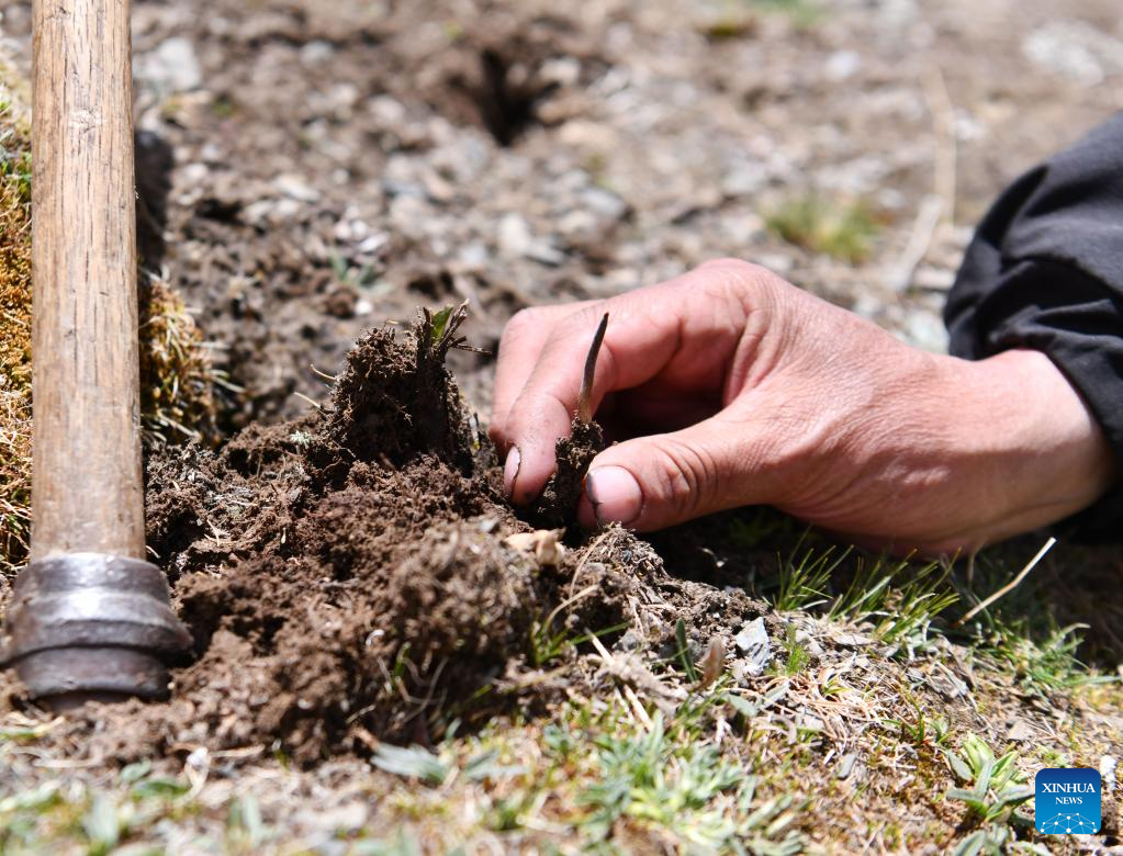 Fungus diggers use an ice pick to prod the earth and dig a hole about 10 centimeters deep. After plucking the fungus from the soil, the diggers fill up the hole with the removed earth to restore the natural soil structure for fostering caterpillar fungus in the coming year.