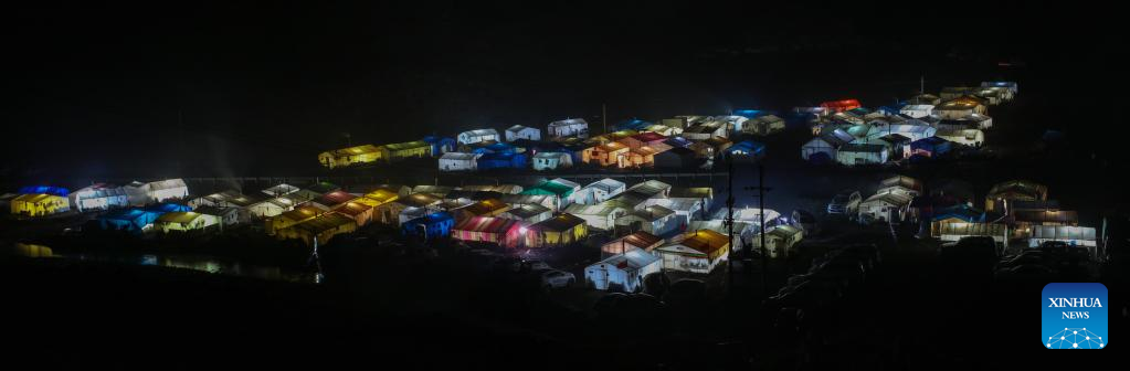 Illuminated tents are seen at a caterpillar fungus collecting site in Lainqu Township, Biru County of Nagqu, southwest China's Tibet Autonomous Region, May 25, 2022.