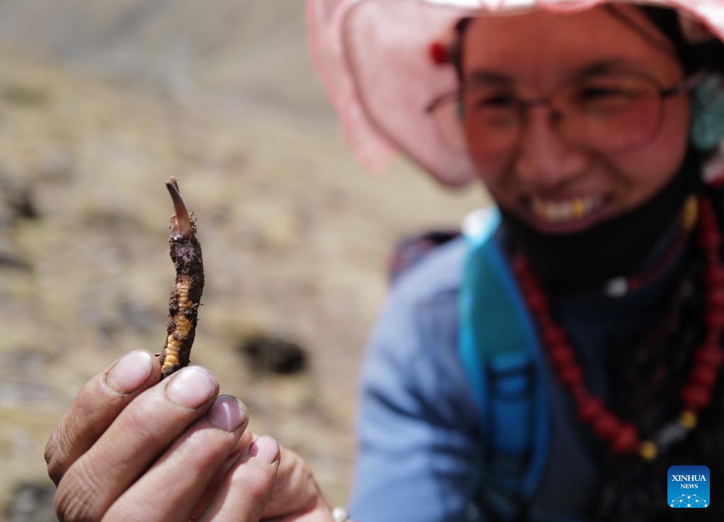 Herdswoman Qime Garde shows a newly-harvested caterpillar fungus in Biru County of Nagqu, southwest China's Tibet Autonomous Region, May 25, 2022.