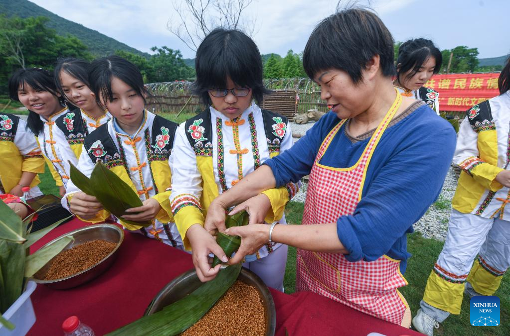 Students make Zongzi, a pyramid-shaped dumpling made of glutinous rice wrapped in bamboo or reed leaves, during a celebration for the upcoming Dragon Boat Festival at a farm in Huzhou City, east China's Zhejiang Province, May 31, 2022. The Dragon Boat Festival would fall on June 3 this year. (Xinhua/Xu Yu)