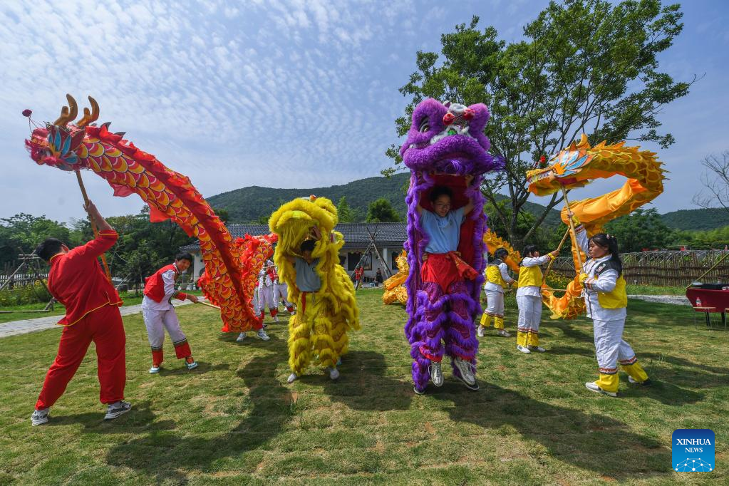 Children attend activities celebrating the upcoming Dragon Boat Festival at a farm in Huzhou City, east China's Zhejiang Province, May 31, 2022. The Dragon Boat Festival would fall on June 3 this year. (Xinhua/Xu Yu)