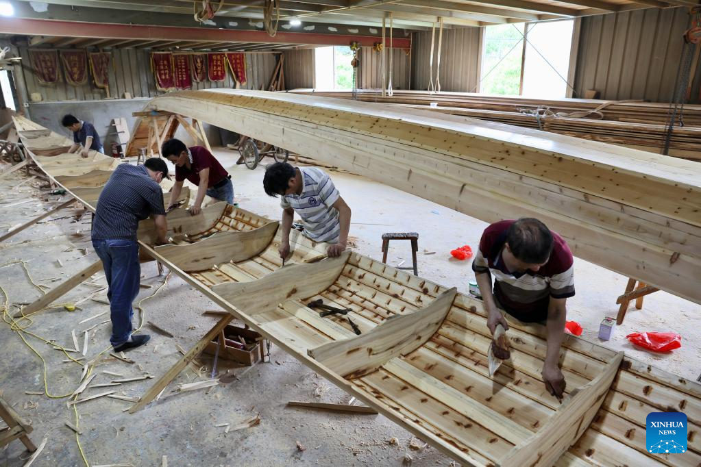 Craftsmen fill waterproofing material in a new dragon boat at Fangzhongxiong dragon boat factory in Fangzhuang Village of Nantong Township in Minhou County of Fuzhou, southeast China's Fujian Province, May 30, 2022. Fangzhuang, known as "Dragon Boat Village", has a traditional dragon boat manufacturing history for more than 700 years. Every year, more than 200 hand-made wooden boats, carefully built by craftsmen, are sold nationwide and even overseas from the village. (Xinhua/Jiang Kehong)