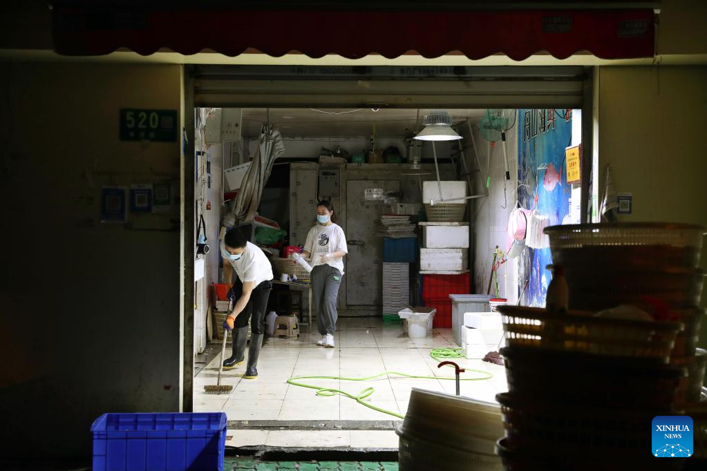 Owners of a seafood shop clean their store in preparation for the reopening of the store in Minhang District, east China's Shanghai, June 1, 2022. (Xinhua/Liu Ying)