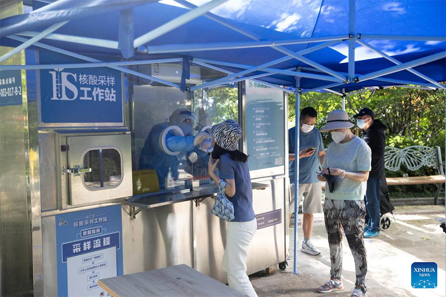 A medical worker takes a swab sample from a resident for nucleic acid test in Huangpu District of Shanghai, east China, May 31, 2022. (Xinhua/Jin Liwang)