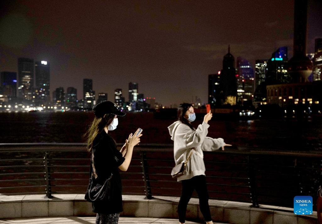 People take photos during the wee hours at the Bund in east China's Shanghai, June 1, 2022. (Xinhua/Jin Liwang)