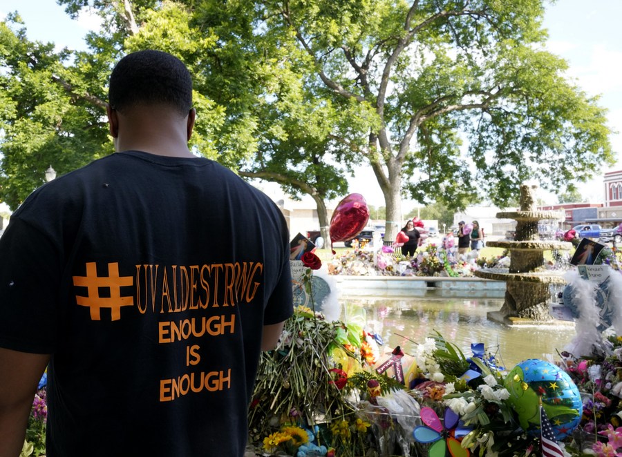 People mourn for victims of a school mass shooting at Town Square in Uvalde, Texas, the United States, May 31, 2022. (Xinhua/Wu Xiaoling)