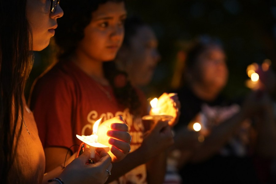 People attend a vigil to mourn for victims of a school mass shooting at Town Square in Uvalde, Texas, the United States, May 29, 2022. (Xinhua/Wu Xiaoling)