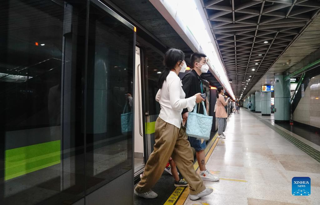 Passengers get off a subway train at East Nanjing Road Station in east China's Shanghai, June 1, 2022. (Xinhua/Ding Ting)