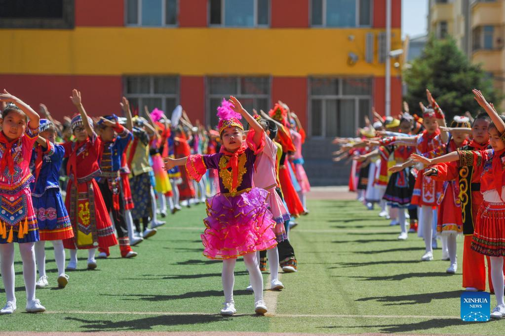 Students dance to celebrate the International Children's Day at a primary school in Hohhot, north China's Inner Mongolia Autonomous Region, June 1, 2022. (Xinhua/Liu Lei)