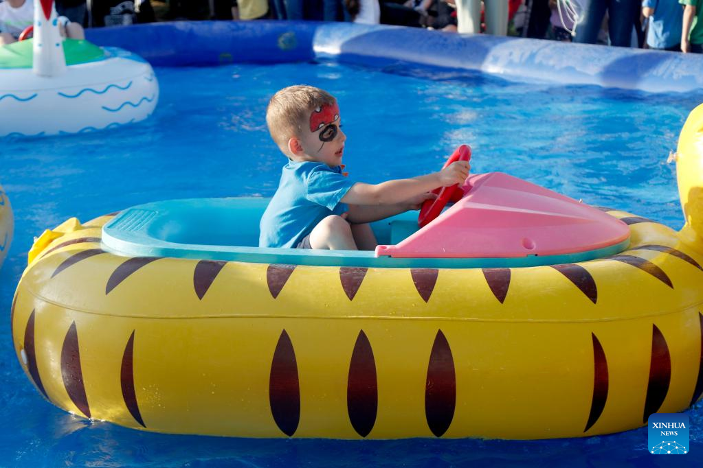 (220601) -- GERI (CYPRUS), June 1, 2022 (Xinhua) -- A boy plays at a park during an event to celebrate International Children's Day in Geri, ten kilometers southeast of Nicosia, Cyprus, on June 1, 2022. (Photo by George Christophorou/Xinhua)