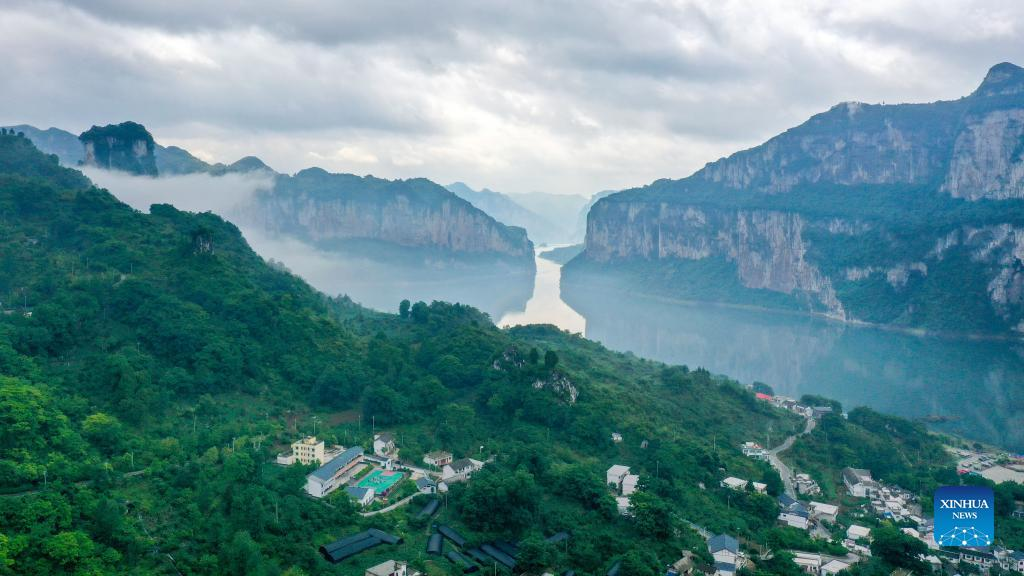 Aerial photo taken on June 1, 2022 shows a view of a primary school in Huawu Village of Xinren Miao Township, Qianxi City, southwest China's Guizhou Province. Yang Yameng is a pupil living in Huawu Village in southwest China's Guizhou Province. Her hometown was once an extremely impoverished village. In recent years, with a package of supporting policies, poverty has been eliminated in the village through boosting crop and animal husbandry industries as well as promoting tourism, and villagers already have got access to roads, water supply, electricity connections and internet. Yang Yameng's families have ridden the wave of agritourism and started a homestay business. Just like Yang's family, migrant workers who once left for a better life have gradually chosen to return to Huawu, engaging themselves in cooperatives or homestay businesses. (Xinhua/Ou Dongqu)