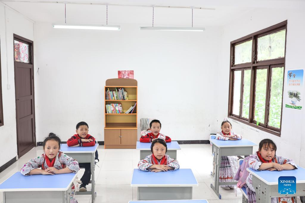 Yang Yameng (1st L) attends a class with her classmates at a primary school in Huawu Village of Xinren Miao Township, Qianxi City, southwest China's Guizhou Province, June 1, 2022. Yang Yameng is a pupil living in Huawu Village in southwest China's Guizhou Province. Her hometown was once an extremely impoverished village. In recent years, with a package of supporting policies, poverty has been eliminated in the village through boosting crop and animal husbandry industries as well as promoting tourism, and villagers already have got access to roads, water supply, electricity connections and internet. Yang Yameng's families have ridden the wave of agritourism and started a homestay business. Just like Yang's family, migrant workers who once left for a better life have gradually chosen to return to Huawu, engaging themselves in cooperatives or homestay businesses. (Xinhua/Ou Dongqu)