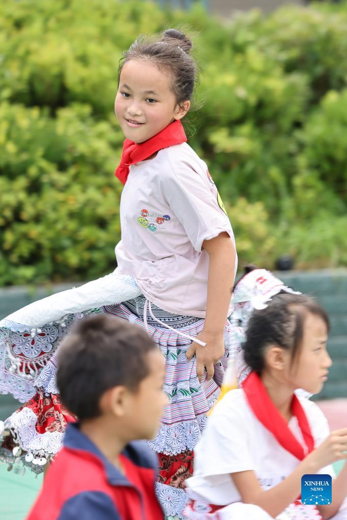 Yang Yameng (back) participates in a game with her schoolmates at a primary school in Huawu Village of Xinren Miao Township, Qianxi City, southwest China's Guizhou Province, June 1, 2022. Yang Yameng is a pupil living in Huawu Village in southwest China's Guizhou Province. Her hometown was once an extremely impoverished village. In recent years, with a package of supporting policies, poverty has been eliminated in the village through boosting crop and animal husbandry industries as well as promoting tourism, and villagers already have got access to roads, water supply, electricity connections and internet. Yang Yameng's families have ridden the wave of agritourism and started a homestay business. Just like Yang's family, migrant workers who once left for a better life have gradually chosen to return to Huawu, engaging themselves in cooperatives or homestay businesses. (Xinhua/Ou Dongqu)