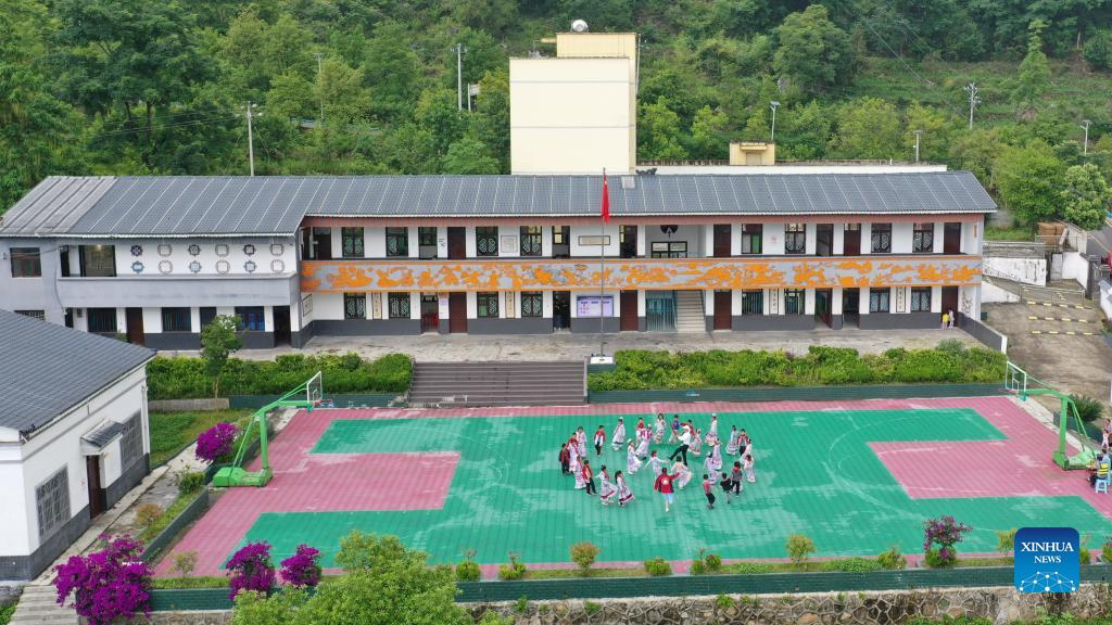 Aerial photo taken on June 1, 2022 shows pupils dancing in celebration of the International Children's Day at a primary school in Huawu Village of Xinren Miao Township, Qianxi City, southwest China's Guizhou Province. Yang Yameng is a pupil living in Huawu Village in southwest China's Guizhou Province. Her hometown was once an extremely impoverished village. In recent years, with a package of supporting policies, poverty has been eliminated in the village through boosting crop and animal husbandry industries as well as promoting tourism, and villagers already have got access to roads, water supply, electricity connections and internet. Yang Yameng's families have ridden the wave of agritourism and started a homestay business. Just like Yang's family, migrant workers who once left for a better life have gradually chosen to return to Huawu, engaging themselves in cooperatives or homestay businesses. (Xinhua/Ou Dongqu)
