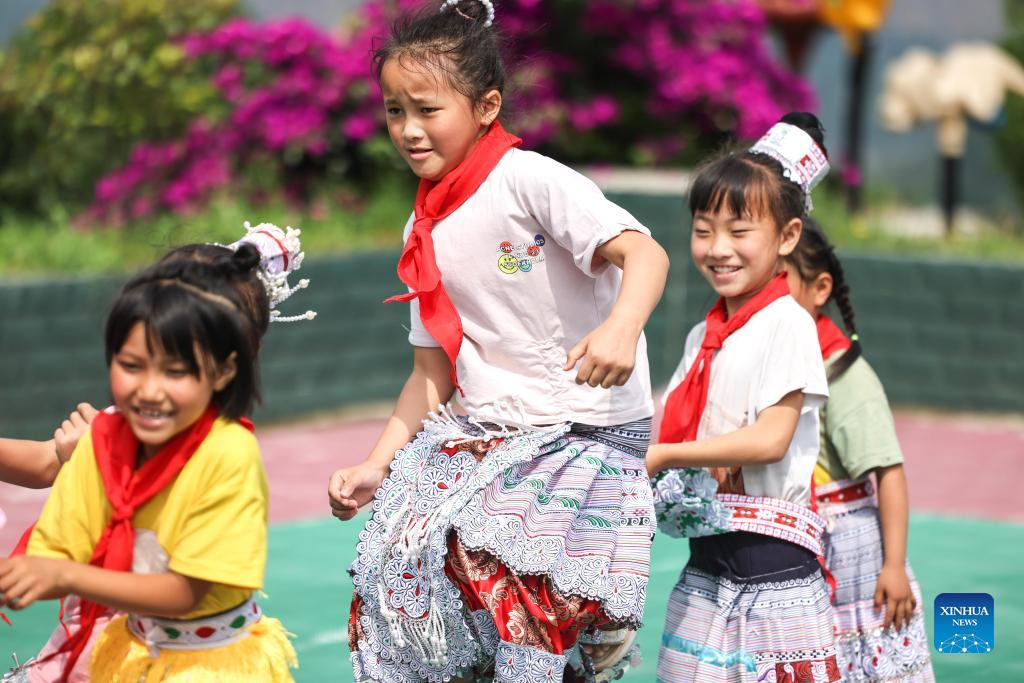 Yang Yameng (C) participates in a game with her schoolmates at a primary school in Huawu Village of Xinren Miao Township, Qianxi City, southwest China's Guizhou Province, June 1, 2022. Yang Yameng is a pupil living in Huawu Village in southwest China's Guizhou Province. Her hometown was once an extremely impoverished village. In recent years, with a package of supporting policies, poverty has been eliminated in the village through boosting crop and animal husbandry industries as well as promoting tourism, and villagers already have got access to roads, water supply, electricity connections and internet. Yang Yameng's families have ridden the wave of agritourism and started a homestay business. Just like Yang's family, migrant workers who once left for a better life have gradually chosen to return to Huawu, engaging themselves in cooperatives or homestay businesses. (Xinhua/Ou Dongqu)