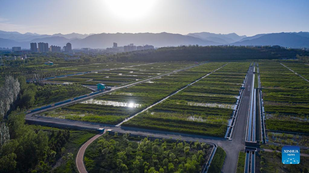 Aerial photo taken on May 30, 2022 shows water quality improvement project of Xinghai Lake in Shizuishan City, northwest China's Ningxia Hui Autonomous Region. (Xinhua/Yang Zhisen)