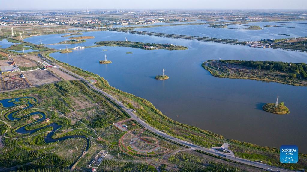 Aerial photo taken on May 30, 2022 shows the scenery of Xinghai Lake in Shizuishan City, northwest China's Ningxia Hui Autonomous Region. (Xinhua/Yang Zhisen)