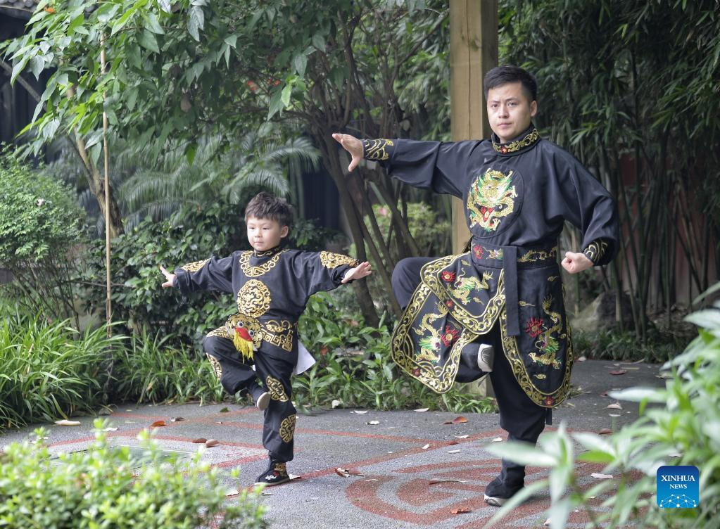 Hua Hua practices basic skills with his father Zhou Zhenghua in Chengdu, southwest China's Sichuan Province, May 25, 2022. Hua Hua (nickname), a 6-year-old boy, is a Sichuan opera fan, learner and an internet celebrity with more than 8 million fans following his learning process. Influenced by his father Zhou Zhenghua, who is a professional Sichuan opera actor, Hua Hua has started to learn basic skills of Sichuan Opera for a while. In January this year, Hua Hua became an apprentice of Sichuan opera master Zhang Lianseng for further learning. (Xinhua/Liu Kun)