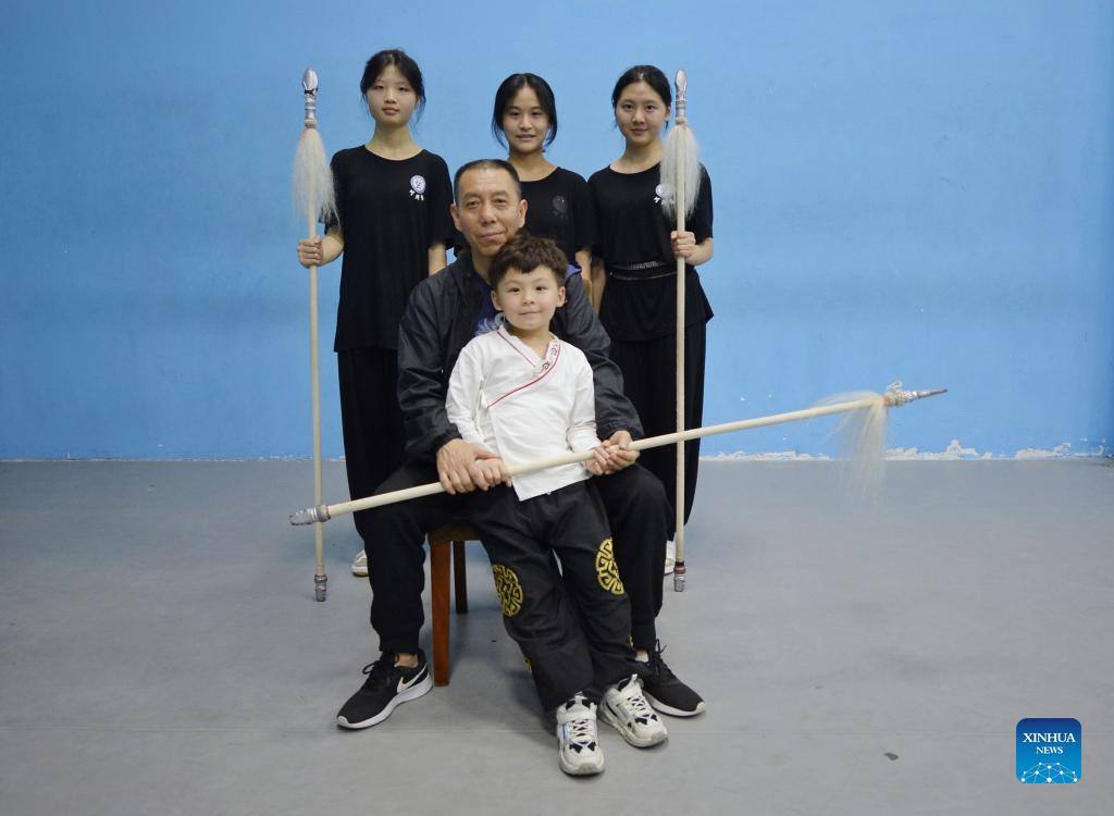 Hua Hua poses for group photos with his master Zhang Lianseng and other apprentices in Chengdu, southwest China's Sichuan Province, May 27, 2022. Hua Hua (nickname), a 6-year-old boy, is a Sichuan opera fan, learner and an internet celebrity with more than 8 million fans following his learning process. Influenced by his father Zhou Zhenghua, who is a professional Sichuan opera actor, Hua Hua has started to learn basic skills of Sichuan Opera for a while. In January this year, Hua Hua became an apprentice of Sichuan opera master Zhang Lianseng for further learning. (Xinhua/Liu Kun)