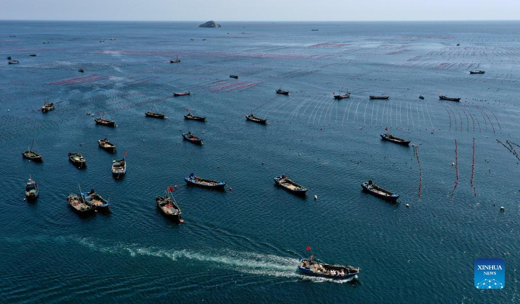 Aerial photo taken on May 31, 2022 shows fishermen working at a marine ranch in Haiyangdao Township of Changhai County in Dalian, northeast China's Liaoning Province. More than 10 state-level marine ranch demonstration zones have been approved in Changhai County since 2016. (Xinhua/Yao Jianfeng)