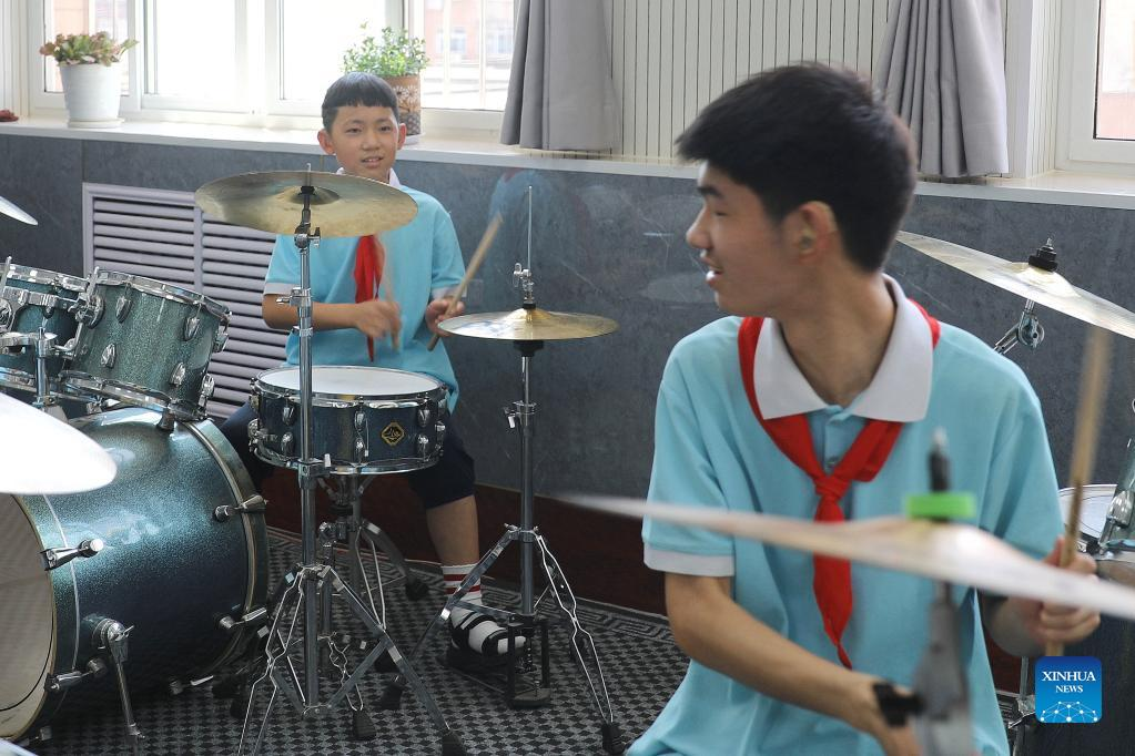 Zhao Kangtai (R) and his younger brother Zhao Kangyuan play the drum set at the music classroom of Xinji Special Education School in Xinji, north China's Hebei Province, May 31, 2022. In the municipal special-education school of Xinji City, Hebei Province, a jazz drumming band named "Against the Wind" is making hopeful beats in world of silence. Founded in December 2018, the band is home to 10 students with hearing impairment or intellectual disability. The band has been undergoing systematic and hard training since its establishment and the endeavors paid off when the band made a stunning rendering in the city's cultural performance among primary and secondary school students. "I named the band 'Against the Wind' to encourage the students to hold onto their dreams, have the grit to face up to challenges and new things as well as fly bravely toward their bright futures," said Sun Shicha, a teacher of the special-education school and the organizer of the jazz drumming band. In 2020, the school created a specialized music classroom, where the band can carry out routine practices. So far, the drum band is able to perform some 10 pieces of music. "The drum band has an invisible and formative influence on teenagers," said Sun. "The students are seen with more resilience and confidence since they joined the band. Meanwhile, their ability in terms of coordination and comprehension have also greatly improved." (Xinhua/Luo Xuefeng)