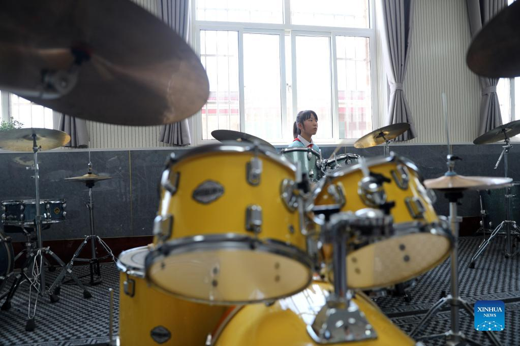 Student Li Aitong plays the drum set at the music classroom of Xinji Special Education School in Xinji, north China's Hebei Province, May 31, 2022. In the municipal special-education school of Xinji City, Hebei Province, a jazz drumming band named "Against the Wind" is making hopeful beats in world of silence. Founded in December 2018, the band is home to 10 students with hearing impairment or intellectual disability. The band has been undergoing systematic and hard training since its establishment and the endeavors paid off when the band made a stunning rendering in the city's cultural performance among primary and secondary school students. "I named the band 'Against the Wind' to encourage the students to hold onto their dreams, have the grit to face up to challenges and new things as well as fly bravely toward their bright futures," said Sun Shicha, a teacher of the special-education school and the organizer of the jazz drumming band. In 2020, the school created a specialized music classroom, where the band can carry out routine practices. So far, the drum band is able to perform some 10 pieces of music. "The drum band has an invisible and formative influence on teenagers," said Sun. "The students are seen with more resilience and confidence since they joined the band. Meanwhile, their ability in terms of coordination and comprehension have also greatly improved." (Xinhua/Luo Xuefeng)