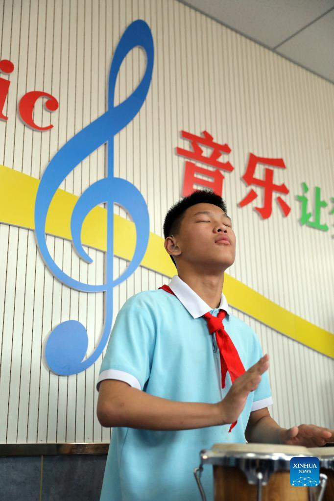 Student Liu Junhong practices playing drums at the music classroom of Xinji Special Education School in Xinji, north China's Hebei Province, May 31, 2022. In the municipal special-education school of Xinji City, Hebei Province, a jazz drumming band named "Against the Wind" is making hopeful beats in world of silence. Founded in December 2018, the band is home to 10 students with hearing impairment or intellectual disability. The band has been undergoing systematic and hard training since its establishment and the endeavors paid off when the band made a stunning rendering in the city's cultural performance among primary and secondary school students. "I named the band 'Against the Wind' to encourage the students to hold onto their dreams, have the grit to face up to challenges and new things as well as fly bravely toward their bright futures," said Sun Shicha, a teacher of the special-education school and the organizer of the jazz drumming band. In 2020, the school created a specialized music classroom, where the band can carry out routine practices. So far, the drum band is able to perform some 10 pieces of music. "The drum band has an invisible and formative influence on teenagers," said Sun. "The students are seen with more resilience and confidence since they joined the band. Meanwhile, their ability in terms of coordination and comprehension have also greatly improved." (Xinhua/Luo Xuefeng)